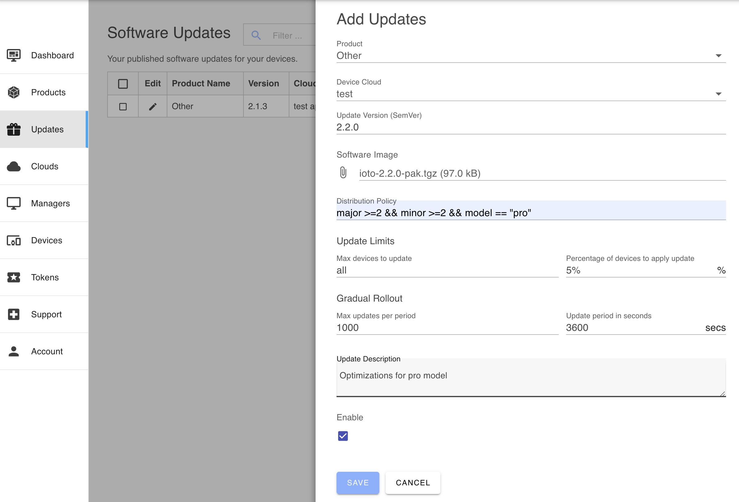 Software updates are reliably stored in a device cloud and distributed globally via the AWS CDN to local regions. When defining updates, you can select your device cloud to store and manage the updates. Select the device cloud from the pulldown list. The update facility is designed to scale and will handle device populations up to and beyond 10,000,000 devices.